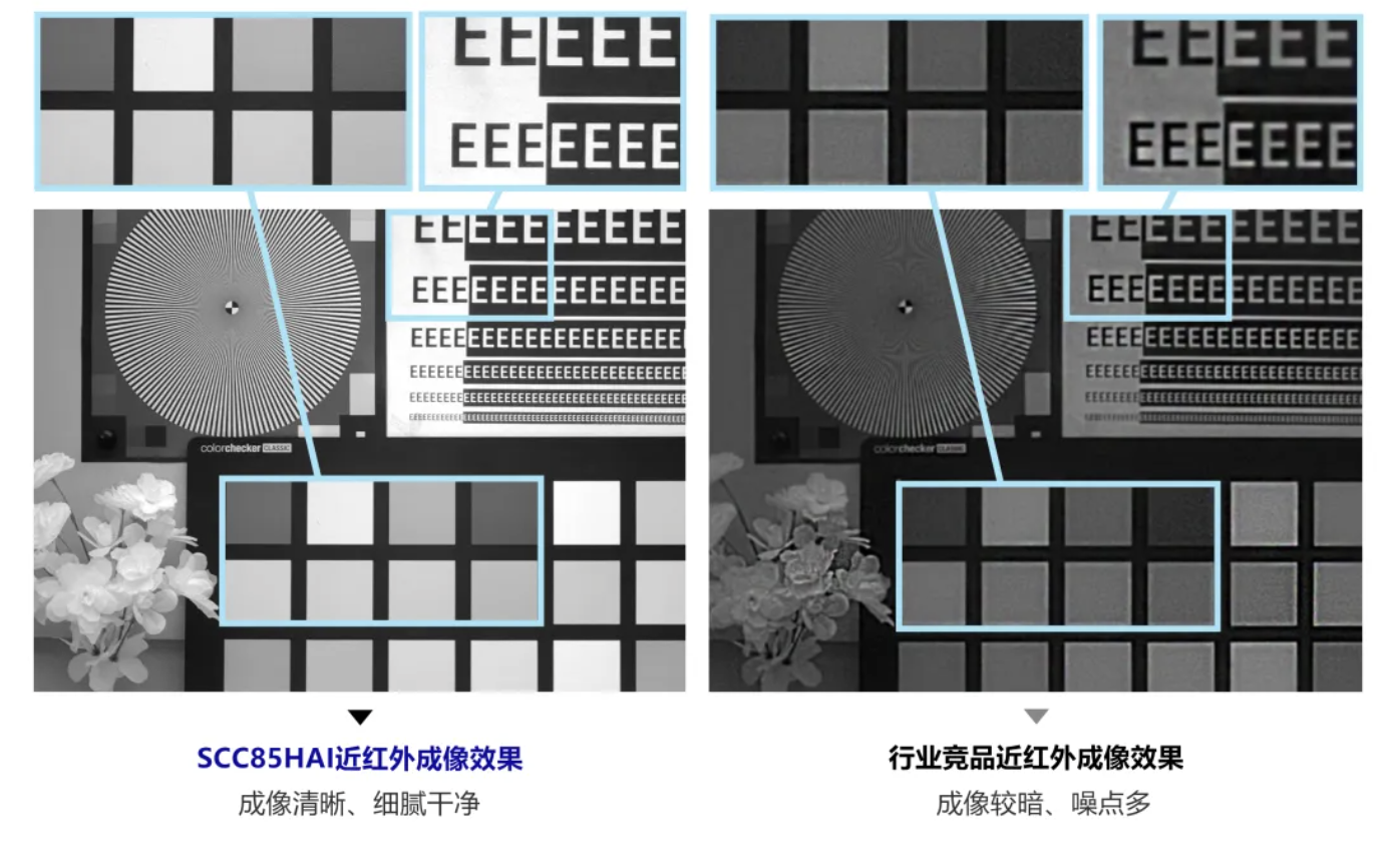 据介绍,SCC85HAI 拥有 5120H×3072V 分辨率,具备横纵画幅冗余,支持 16:9 和 4:3 的两种画幅比例输出,可应用在球机、鱼眼全景监控等多种安防监控设备。搭载 Lightbox IR 近红外增强技术,实现了可见光与近红外波段下感度的提升。