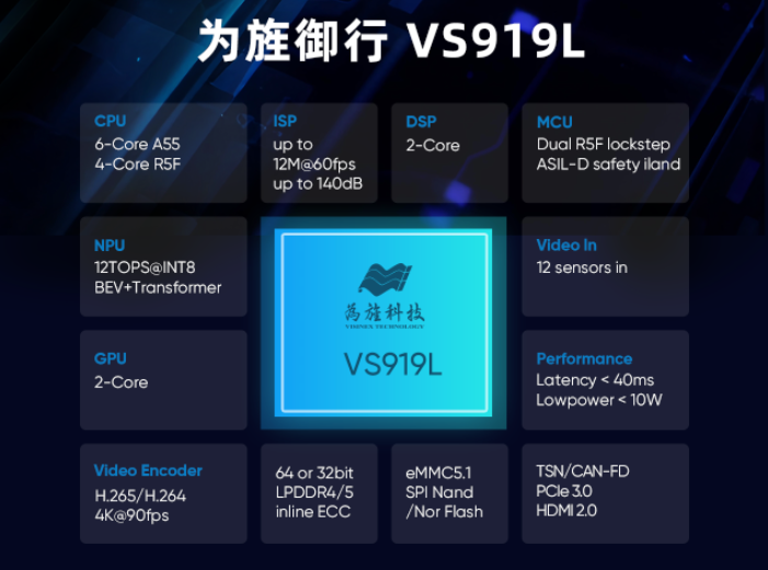 针对新强标要求与市场痛点,VS919L 以多核异构架构筑牢技术底座:主域集成6核A55与4核R5F,提供32K DMIPS 通用算力;独立安全岛搭载双核 R5F,支持锁步模式确保关键任务可靠调度;全自研NPU具备12TOPS@INT8可编程AI算力,高效运行BEV+Transformer等先进感知模型,精准融合多传感器数据;双核DSP支持4D卫星雷达方案,全自研 ISP通过多帧降噪技术,在低光照环境下仍能输出140dB高动态范围的清晰图像。从感知到决策再到执行,全链路技术加持让VS919L从容适配新强标,更能应对复杂场景下的智驾需求。