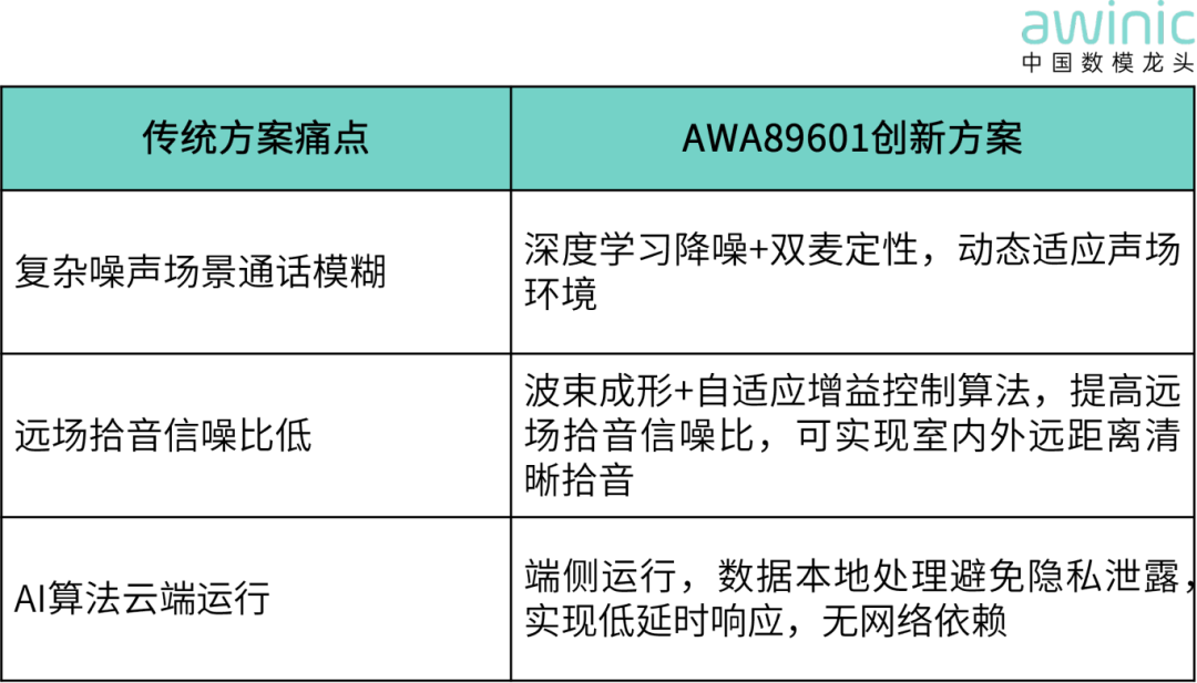 AWA89601芯片的核心创新在于搭载了端侧NPU,内集成音频专用NPU提供端侧推理算力,支持实时处理4路上行语音。相比云端方案,这种集成电路设计实现了数据本地处理,有效避免隐私泄露,同时实现低延时响应,无需依赖网络连接。