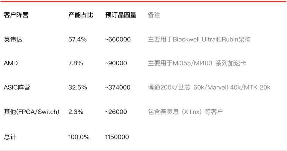 总体来看,产品需求最旺、单价最高、技术最领先的英伟达有望拿到其中近60%的产能;AMD的预定量在90K左右,占比接近8%,相比2025年有64%的增量,增幅几乎与英伟达一致。