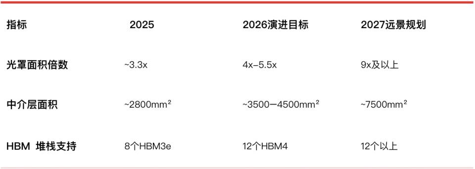 前面表1有提到,硅中介层面积越来越大的变化趋势,是AI芯片明确的技术路线,目前中介层面积是光罩面积的3.3x,2026年的Rubin将提升到是4~5.5x,而2027年4-die合封的Rubin Ultra将达到9~9.5x。