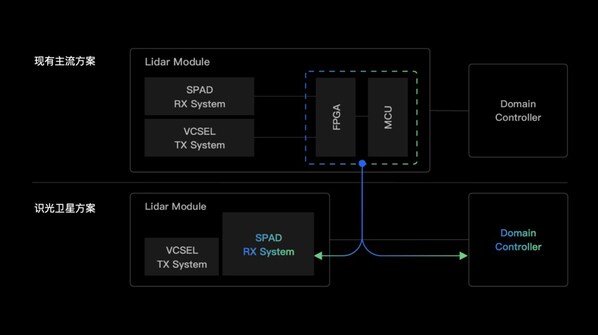 得益于 SA100 的高集成度,识光为激光雷达/自动驾驶解决方案提供了一个降本的新路径,即识光的卫星方案。无需 FPGA / MCU,SA100 SPAD-SoC 即可对激光雷达数据进行片上处理并直接传输给域控,实现算力上移,由域控进行多传感器数据的集中化处理,大幅降低了激光雷达的成本和体积。