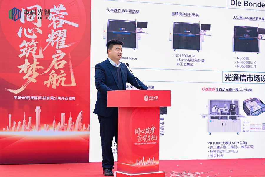 开业仪式上,中科光智成都子公司负责人杨自良围绕公司的核心产品与业务进行了系统性介绍,并分享了公司未来在技术和市场方面的战略发展规划。中科光智成都子公司主要聚焦研发与制造高精度贴片机、光通信封装关键设备以及用于显示封装等领域的设备,解决高端封装领域尤其是第三代半导体(如碳化硅)的工艺难题,致力于成为国产高端封装装备的领先供应商。