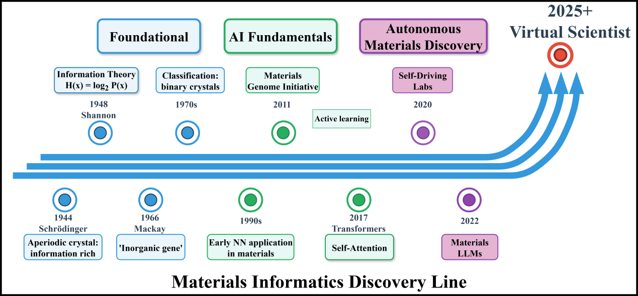 从1944年Schrödinger提出的非周期性晶体概念和1948年Shannon的信息论为基础,经历了1970年代的二元晶体分类研究,到2011年美国材料基因组计划(MGI)的推动。随后,深度学习(如Transformer)和主动学习的引入加速了该领域的发展,直至2020年代自动驾驶实验室的兴起,预示着2025年后将迈向“虚拟科学家”和自主材料发现的新时代。