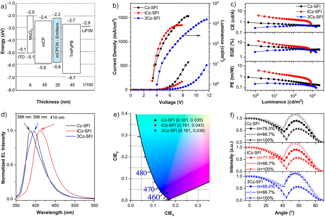 a)器件结构及各功能层的能级示意图。b)电流密度-电压-亮度曲线。c)电流效率(CE)/外量子效率(EQEmax)/功率效率(PE)-亮度曲线。d)器件在6.0 V电压下的电致发光光谱。e) OLED的CIE色度坐标。f)掺杂薄膜中发光体的角度依赖光致发光强度。
