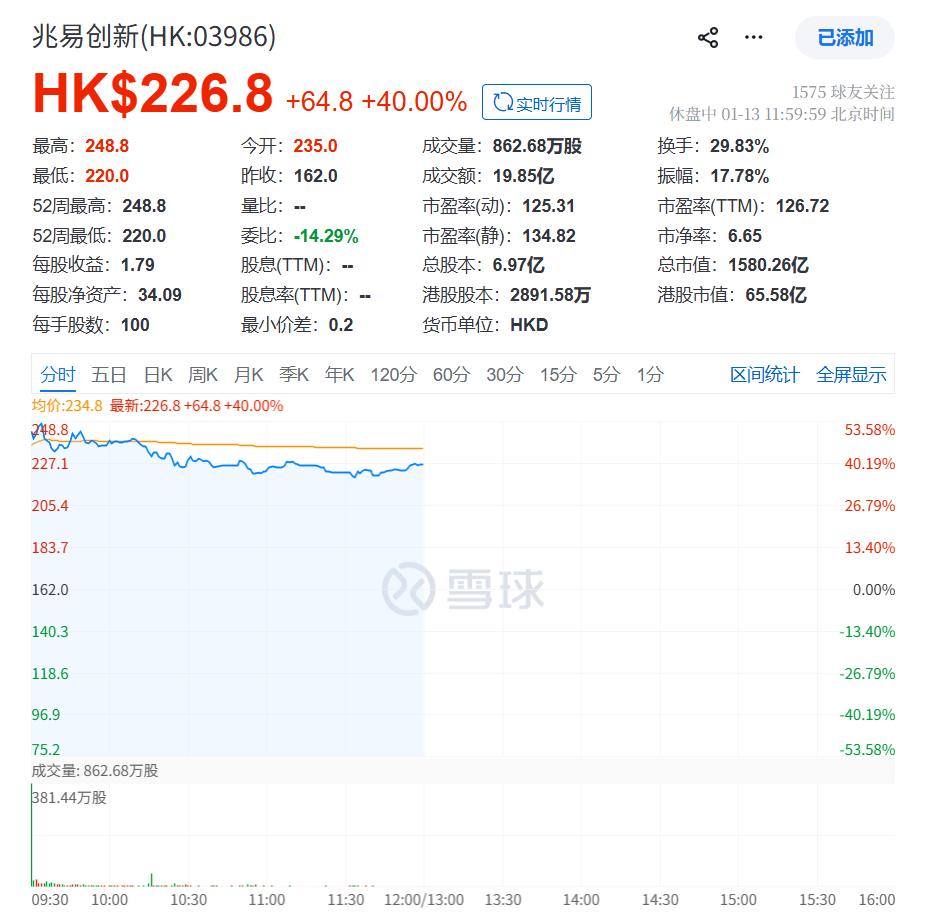 上市首日,兆易创新开盘价为235港元/股,较发行价高开近50%,截至午间休盘,兆易创新股价报226.8港元/股,总市值1580.26亿港元,其A股总市值也在盘中达到1800亿元人民币,创下上市以来的最高纪录。