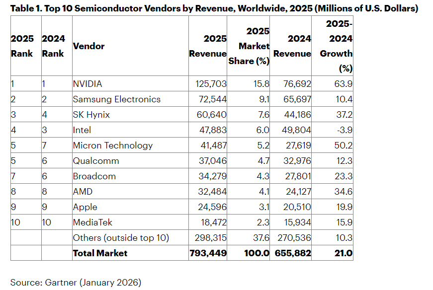 英特尔市场份额从2021年的12%缩减至2025年的6%,营收同比下降3.9%至479亿美元,排名第四。美光科技以50.2%的增速(营收415亿美元)升至第五,高通(370亿美元,+12.3%)和博通(343亿美元,+23.3%)分列第六、七位。AMD营收增长34.6%至325亿美元,位列第八;苹果(246亿美元,+19.9%)和联发科(185亿美元,+15.9%)分居第九、十名。