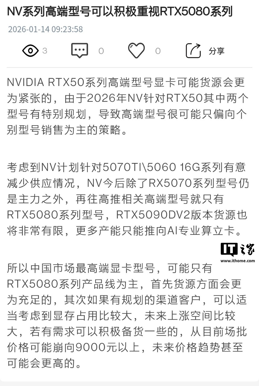 IT之家 1 月 14 日消息,“视博合聚”昨日(1 月 13 日)发布博文,报道称受显存芯片成本持续激增影响,英伟达(Nvidia)计划在 2026 年大幅调整 RTX 50 系列显卡的供应策略。