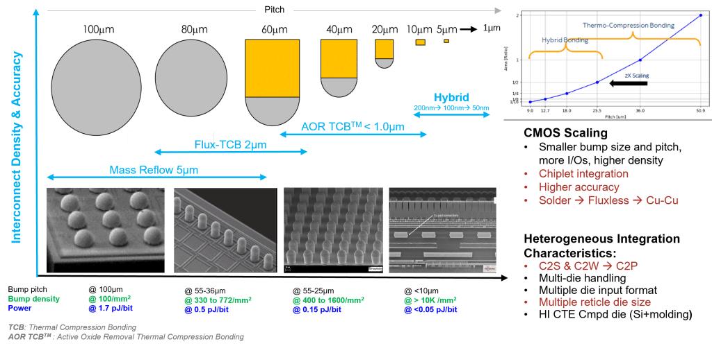 为什么?我们把镜头拉回到 HBM 堆叠装配中的关键工艺——热压键合(TCB)。在各种先进封装架构下,热压键合(TCB)被认为是最先进的互连方法之一。尽管这项技术已经开发并应用了十余年,但由于其在引入时带来的诸多收益,仍在不断被新应用持续采用。需要说明的是,TCB 不仅仅是为了 HBM,它是为了将不同节点的 Chiplets 强行“缝合”在一起的关键手段。