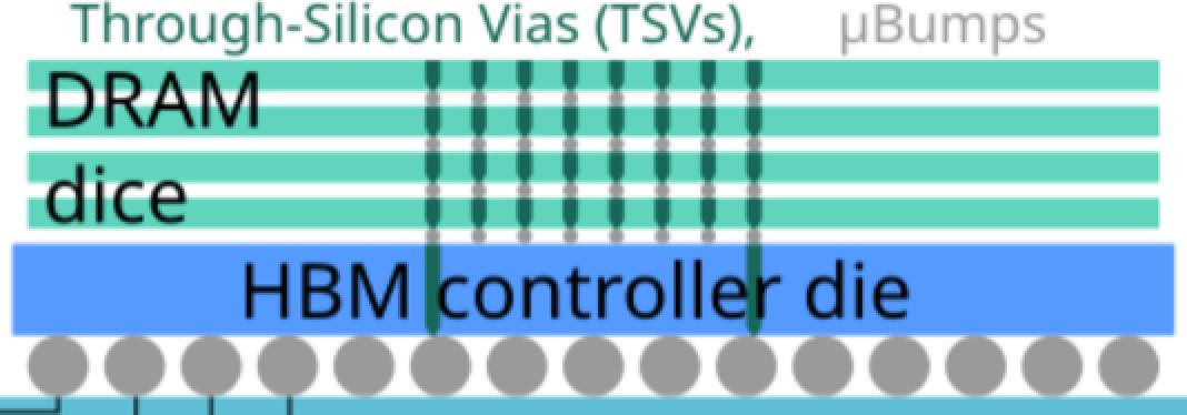 通用 HBM 结构。图中显示了微凸点。采用混合键合技术后,DRAM 芯片之间的间隙将消失。(图源:semiengineering)