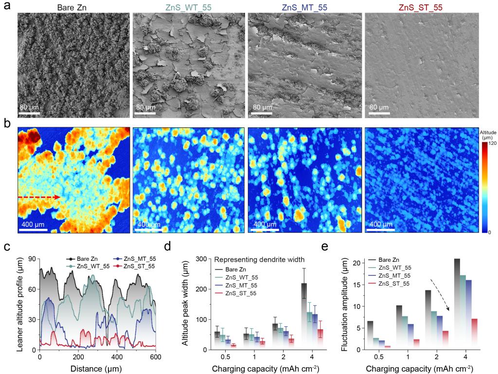 图3. ZnS (111)织构强度主导的枝晶抑制能力。a,0.5 mAh cm-2容量下的锌沉积形貌对比;b-c,沉积层表面的高度轮廓云图及代表性线性截面高度分布;d-e,统计枝晶峰宽及表面高度波动分析。