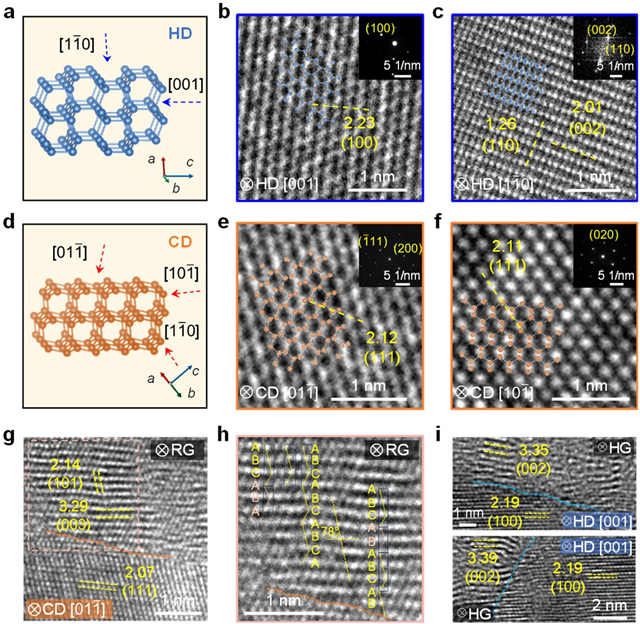 在微观结构与相变机制方面,高分辨透射电镜结果表明二维金刚石中包括立方金刚石(CD)和六方金刚石(HD)两种结构,sp3杂化比例高达89.9%。团队通过分析混合相界面的原子排列,揭示了菱方石墨(RG)作为中间相在六方石墨(HG)向立方金刚石转变过程中的关键作用,并分别确定了六方相石墨向六方相金刚石与立方相金刚石转变过程中的晶体学取向关系,即(002)HG∥(100)HD与(002)HG∥(003)RG∥(111)CD,为揭示碳材料的相变路径提供了实验依据。此外,研究还发现二维金刚石的光学带隙(1.4 ~ 1.9 eV)和热稳定性(高达1000 °C)与其内部的sp3含量密切相关,展现出优异的可调控性。