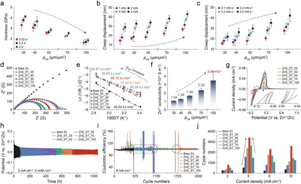 图4. 晶界密度(ρGB)主导的循环稳定性、电化学动力学及力学强度。力学强度:a,不同应变率下的纳米压痕硬度;b-c,不同加载条件下的蠕变测试。电化学动力学:d-g,阻抗谱、反应活化能、离子电导率及循环伏安测试(内嵌沉积/剥离电位放大图)。循环稳定性:h-j,恒电流循环寿命(2.0 mA cm-2,2.0 mAh cm-2)、库伦效率(8.0 mA cm-2,1.0 mAh cm-2)及不同电流密度下的循环周次。