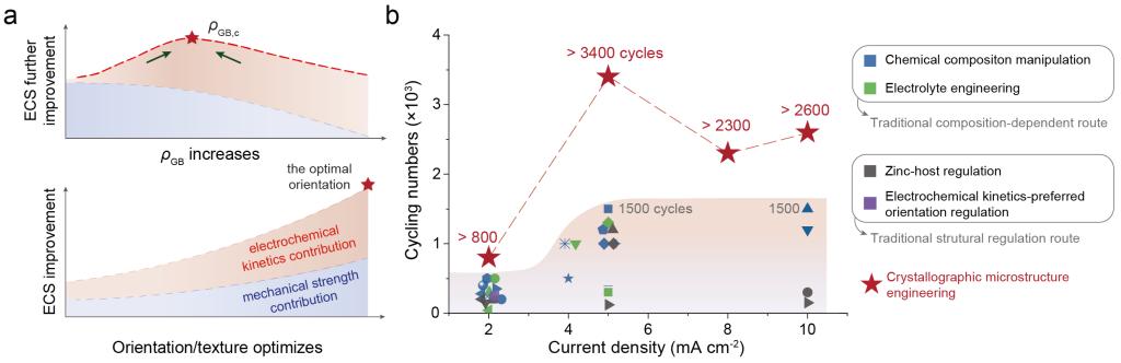 图6. 晶体学微结构工程—ASEI设计新范式。a,工程化路径:通过协同调控关键微结构特征,平衡电化学动力学与力学强度,以实现循环稳定性的最优化;b,效能对比:晶体学微结构工程相较于化学组分调控、电解液工程、锌基体设计等传统策略,在提升锌负极循环寿命方面展现出显著优势。
