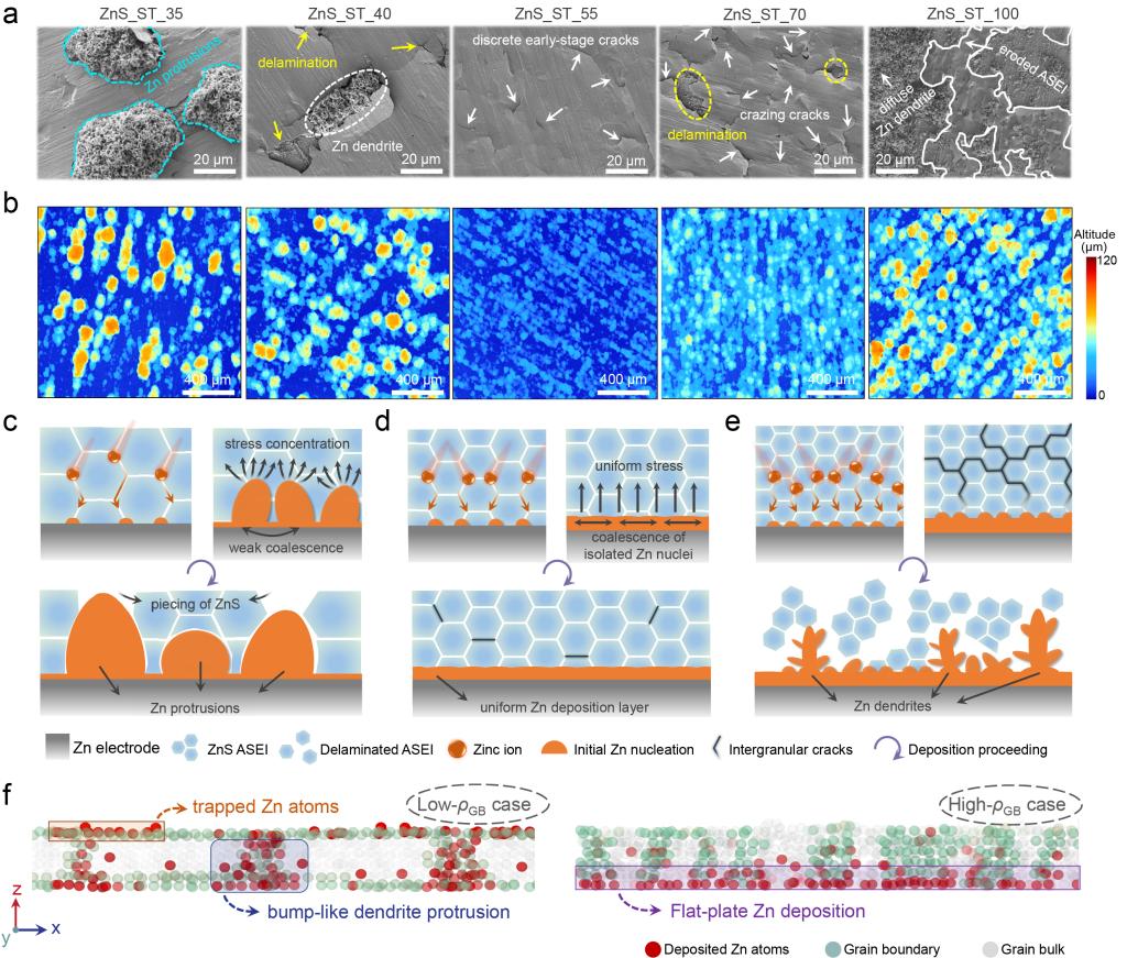 图5. 晶界密度主导的ZnS ASEI失效模式及力-电化学耦合调控机制。a-b,ASEI损伤形貌与枝晶高度轮廓;c-e,ASEI失效机制示意图:揭示过低晶界密度、最优晶界密度及过高晶界密度三种情形下的ASEI演化及沉积层生长过程;f,混合蒙特卡洛/分子动力学模拟,基于原子熵分布揭示晶界密度决定的动力学过程。