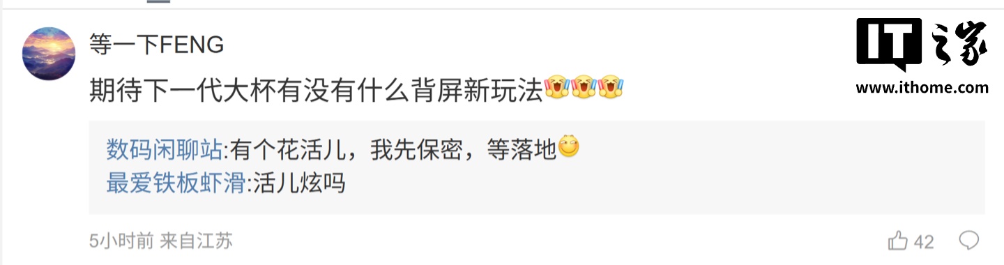 后续有用户在评论区询问:“期待下一代大杯有没有什么背屏新玩法”,博主回复道:“有个花活儿,我先保密,等落地”;另一名用户则询问道:“那中杯能不能吃上淘汰的 hp9 潜望”,博主则回复道:“中杯?小屏想要 2 亿大底长焦?”。