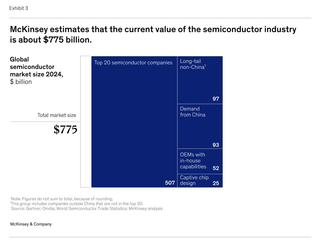 鉴于人工智能预计将推动半导体行业的平均复合年增长率远超2014年至2024年间9%的水平,准确的价值评估比以往任何时候都更加重要。为了更准确地评估半导体行业的价值,麦肯锡分析了所有类型的公司,包括中国的公司。我们没有依赖销售量(因为当公司不直接在市场上销售芯片时,销售量无法准确反映其价值),而是针对每类半导体公司进行了定制分析。例如,对于拥有自主芯片设计的OEM厂商(如智能手机制造商),我们根据其销售成本(COGS)结合产品的典型毛利率来估算其市场贡献。