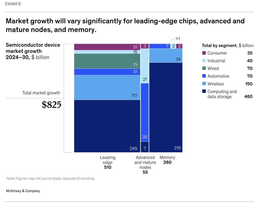 基于此,麦肯锡得出以下主要结论:预计到2030年,半导体销售额将达到1.6万亿美元(区间为1.5万亿美元至1.8万亿美元)——这些数字远超其他预测。但并非所有半导体公司都能平等受益,因为大部分增长将与尖端芯片和高带宽内存(HBM)相关。鉴于半导体行业赢家通吃的格局,少数极具创新精神的公司很可能在这些领域占据最大份额。而在其他市场领域——例如先进成熟工艺节点或DDR——则不然。DRAM 和 NAND 闪存领域的领先企业正积极降低成本,他们或通过扩大规模,或实施传统的成本优化计划。同时,他们也致力于拓展在高增长领域的市场份额,并力求实现产品差异化。