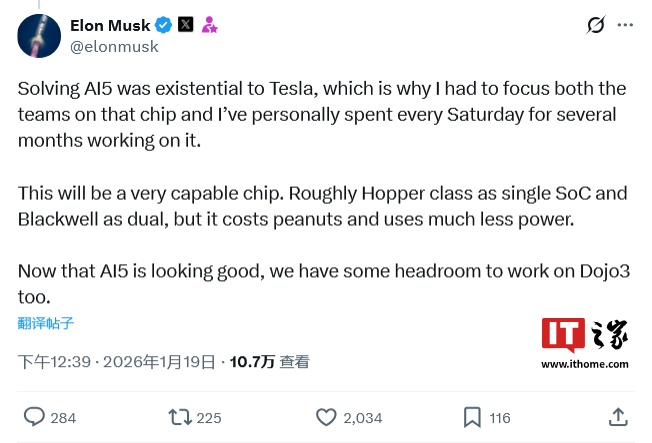 IT之家 1 月 19 日消息,埃隆 · 马斯克刚刚在 X 平台对旗下企业特斯拉的下代人工智能芯片 AI5 发布了进一步的看法,表示 AI5 在单 SoC 下的性能与英伟达 Hopper 相近、双 SoC 配置则能媲美英伟达 Blackwell,同时拥有更低的成本和价格。