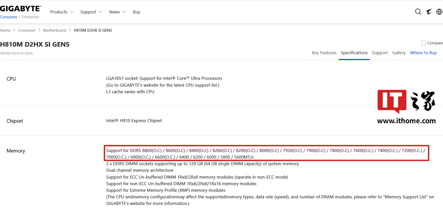 不过,根据台媒 UNIKO's Hardware 的发现,技嘉最近推出的 H810M D2HX SI GEN5 主板在产品规格页面赫然写有支持内存超频到 8800MT/s 的信息: