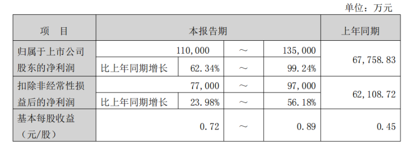 归属于上市公司股东的净利润为14,188,269,426.14元,较上年同期的11,977,327,023.54元增长18.46%;扣除非经常性损益后的归属于上市公司股东的净利润为13,696,015,459.25元,同比增长15.92%。基本每股收益1.545元,同比增长19.12%;加权平均净资产收益率17.29%,较上年同期提升1.95个百分点。