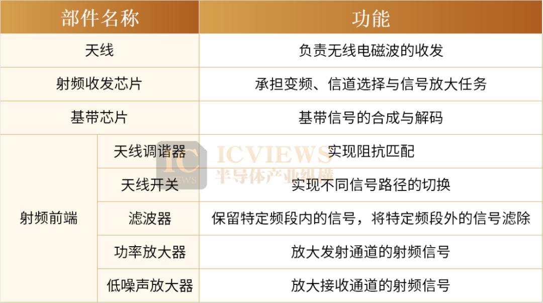 作为关键部分的射频前端又包含多个子模块,射频前端通常由功率放大器(PA)、低噪声放大器(LNA)、滤波器(Filter)/双工器(Duplexer)、射频开关(Switch)、和天线调谐器(Tuner)等器件构成。