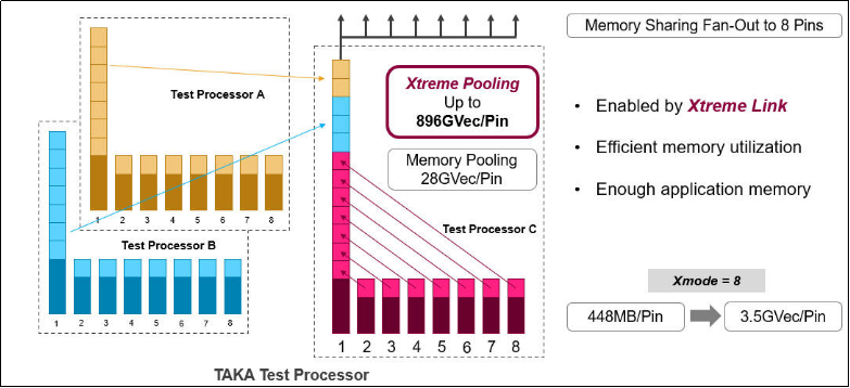 并且爱德万测试在传统Memory Pooling & Sharing的基础上推出了名为Xtreme Memory Pooling的功能,其可以实现整块板卡的存储容量共享, 进一步扩大单根通道的最大向量深度。