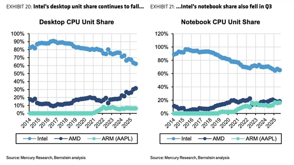 相比之下,曾经的龙头Intel虽仍占据大头,但已从2016年接近100%的巅峰状态下滑至60%左右。