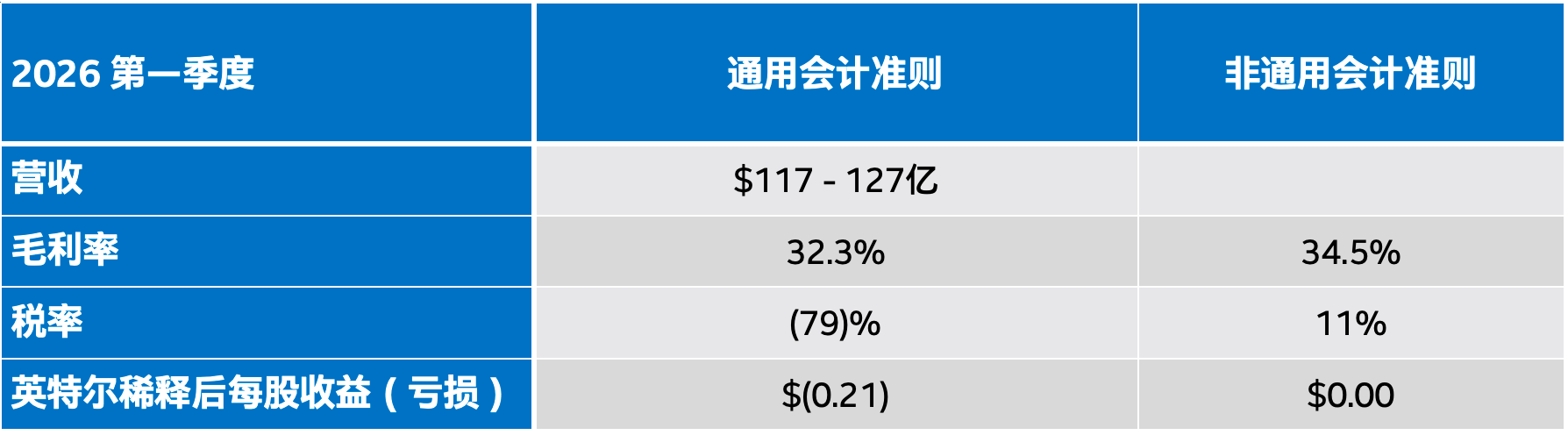 英特尔对2026年第一季度的指导包括以下根据通用会计准则和非通用会计准则的预估: