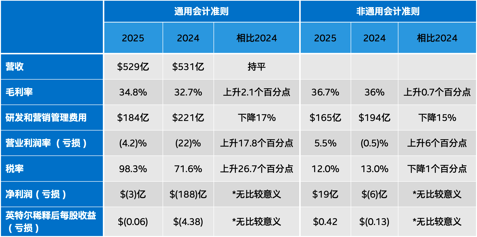 ●第四季度营收137亿美元,同比下降4%。全年营收529亿美元,与去年持平。上述同比数据尚未针对2025年第三季度剥离Altera业务进行调整。