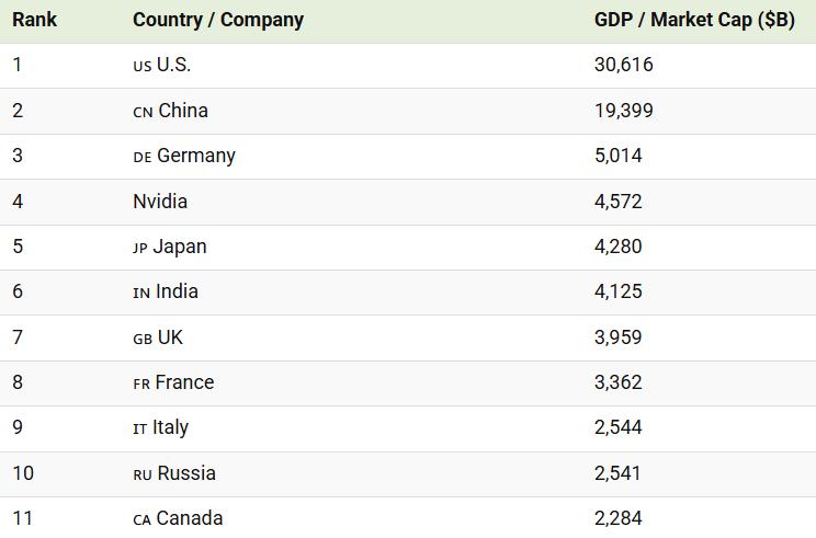如果我们将这一市值放入国际货币基金组织(IMF)的国家GDP排名中,英伟达将超越日本、印度和英国,直接坐上世界第四大经济体的交椅——仅次于美国、中国和德国。