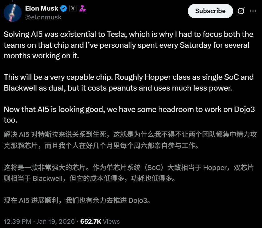 对于特斯拉而言,AI5这颗芯片不仅仅是一次硬件升级,它直接「关系生死」。