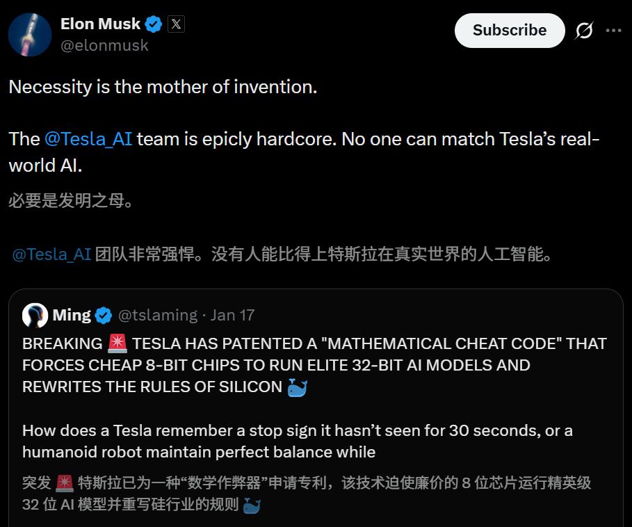 正是在这样一个由5万亿巨头统治、且入场费极其昂贵的「物理AI」赛道上,特斯拉的那种「在8位芯片上跑出32位精度」的突破,才显得尤为关键。