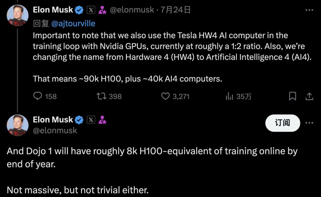 马斯克曾透露,自家AI训练系统中,不仅使用了英伟达GPU,还使用了AI4,比例大约是1:2。