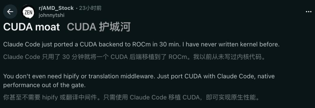 现在,一个Claude却用极短时间踢碎了门槛,说不定未来更多CUDA代码可能轻松在AMD GPU跑起来了。