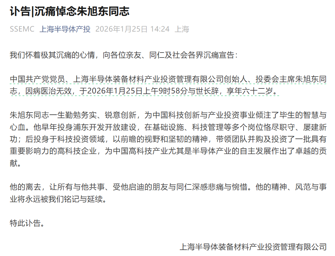 1月25日,上海半导体装备材料产业投资管理有限公司(简称“上海半导体产投”)在官方微信号公告,上海半导体装备材料产业投资管理有限公司创始人、投委会主席朱旭东同志,因病医治无效,于2026年1月25日上午9时58分与世长辞,享年六十二岁。