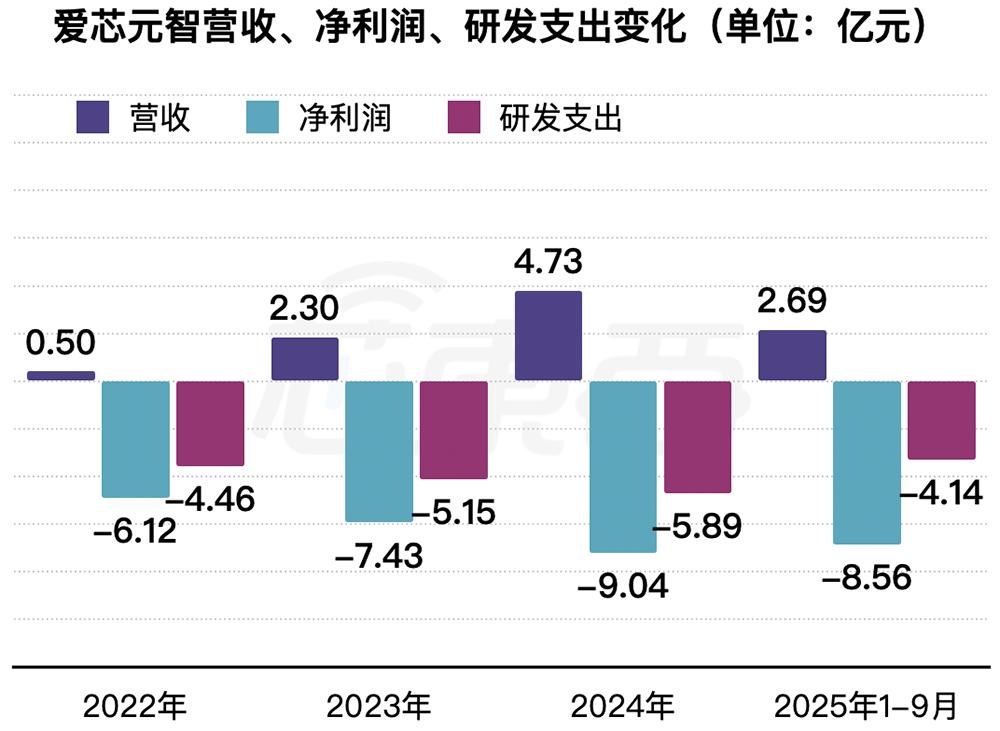2022年、2023年、2024年、2025年1-9月,爱芯元智收入分别为0.50亿元、2.30亿元、4.73亿元、2.69亿元,净利润分别为-6.12亿元、-7.43亿元、-9.04亿元、-8.56亿元,研发费用分别为4.46亿元、5.15亿元、5.89亿元、4.14亿元。