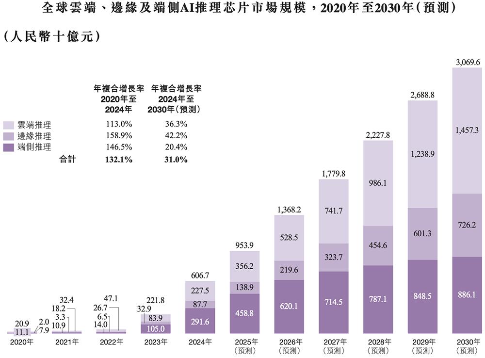 根据招股书,AI推理芯片行业竞争十分激烈并快速演进。全球AI推理芯片市场规模由2020年的209亿元增至2024年的6067亿元,年复合增长率为132.1%,预计2030年将达到3万亿元,2024年至2030年的年复合增长率为31.0%。