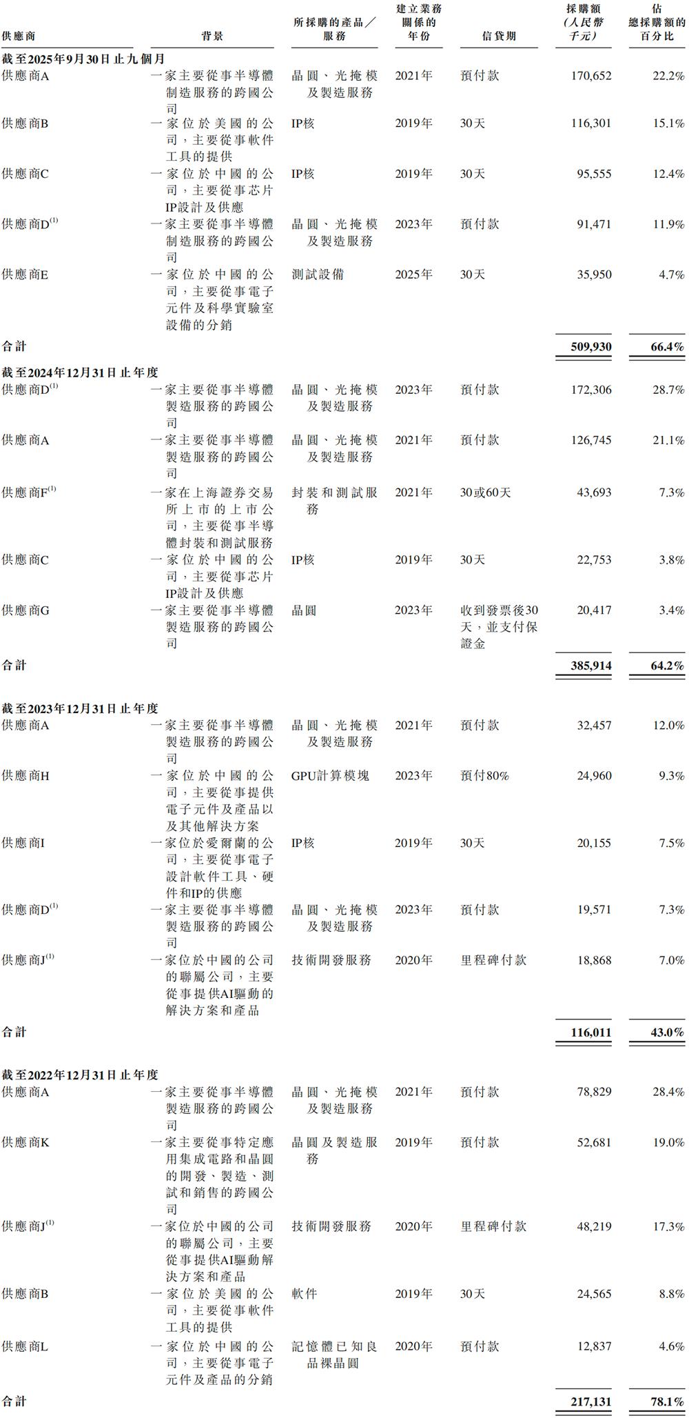 同期,爱芯元智向前五大供应商的采购额分别占总采购额的78.1%、43.0%、64.2%、66.4%。