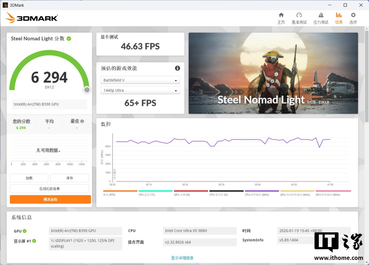 在 3D Mark Steel Nomad Light 测试中,酷睿 Ultra X9 处理器 388H 跑出了 6294 分的成绩,相比酷睿 Ultra 9 285H(intel Arc 140T)的 3277 分,性能提升了 92%。
