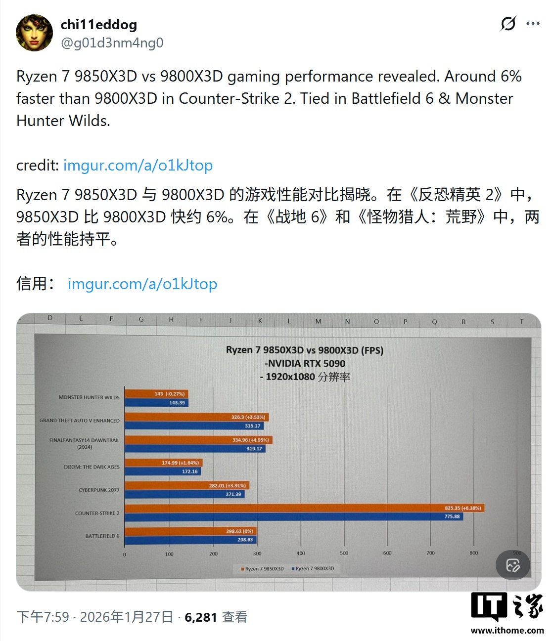 IT之家 1 月 28 日消息,消息源 @g01d3nm4ng0 昨日(1 月 27 日)在 X 平台发布推文,分享了 AMD 新款处理器 Ryzen 9850X3D 的 7 款游戏性能测试数据,显示平均帧率提升幅度在 3% 左右。