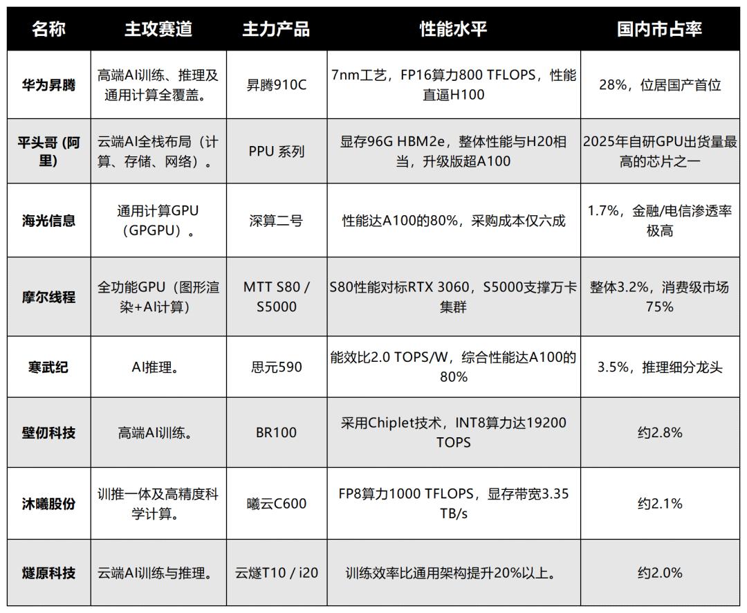 华为昇腾、平头哥、海光信息、摩尔线程、寒武纪、壁仞科技、沐曦股份、燧原科技。