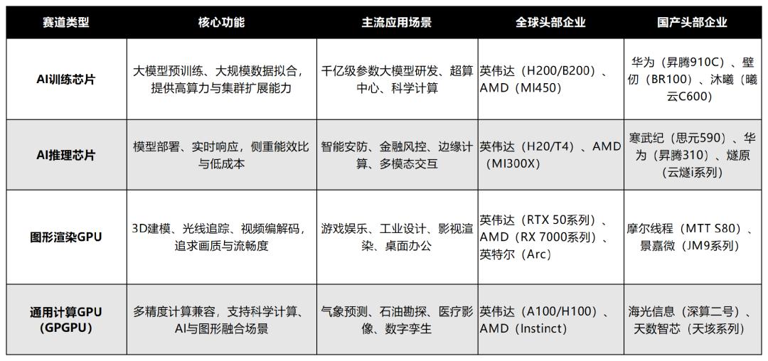 AI训练芯片、AI推理芯片、图形渲染GPU、通用计算GPU。