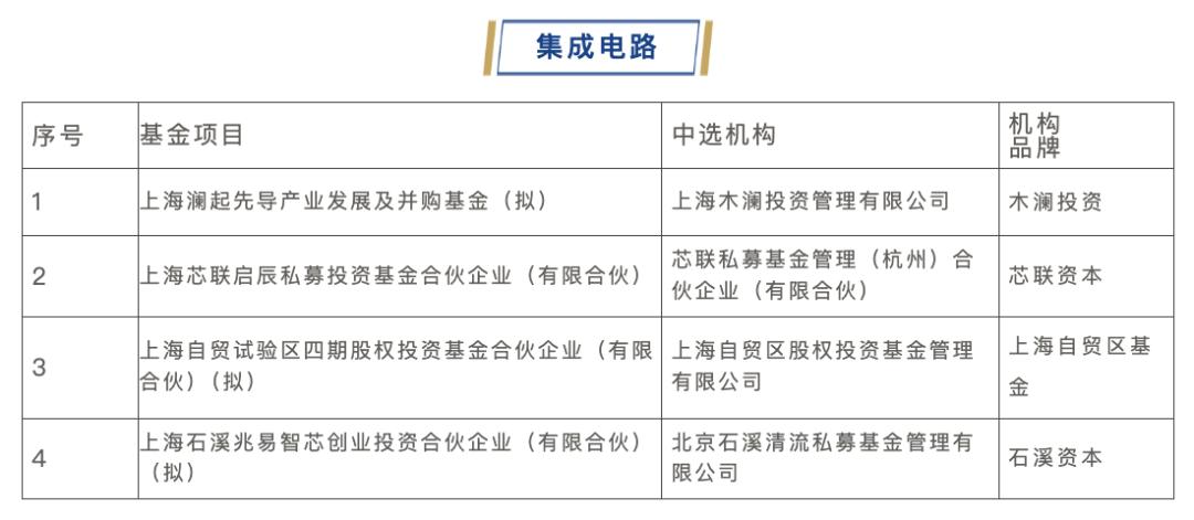 集成电路行业第三批遴选子基金共有4只中选,合计拟投决总额14亿元,放大倍数为5倍。其中芯联资本、石溪资本是集成电路产业大链主直接做CVC,澜起科技是上海本地的芯片设计龙头企业,本次发起设立一只并购策略为主的基金;自贸区基金是上海本地国资管理人,深耕上海10年,背后浮现富乐德集团、先锋精科、赛美特等产业方的身影。