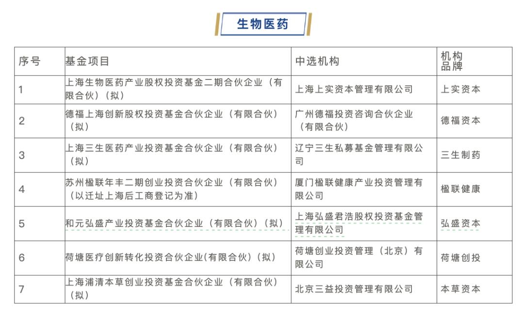 生物医药行业第三批遴选子基金共7只中选,合计投决总额17.4亿元,放大倍数为3.9倍。当中包括德福资本、本草资本为代表的生物医药垂类白马基金,还有以上海生物医药产业基金二期、三生制药基产业基金、楹联恒瑞基金、弘盛和元基金为代表的大型产业方/细分链主企业合作基金。