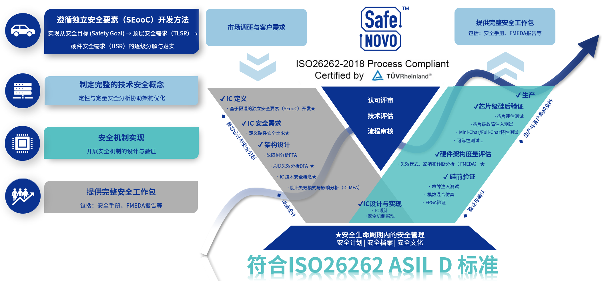 作为汽车模拟芯片行业的头部企业,纳芯微始终重视功能安全体系和产品开发能力建设。NSL21912/16/24FS系列芯片通过 ASIL B 功能安全认证,体现了纳芯微功能安全产品的落地能力。纳芯微的功能安全产品开发流程遵循 ISO 26262 V-Model,专职的功能安全团队在项目初期就深度参与芯片 SEooC(Safety Element out of Context) 制定,在主导芯片安全架构定义的同时,持续运用多种安全分析方法优化设计合理性。