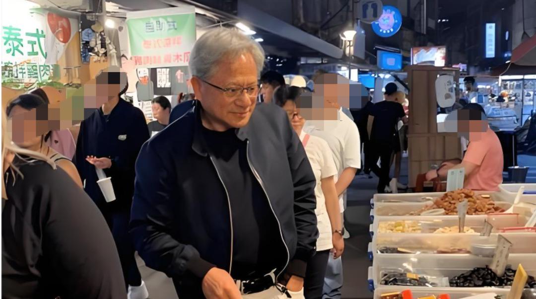黄仁勋依然穿着那件标志性的黑皮夹克,笑容温和,在菜市场、餐厅和办公室之间穿梭。