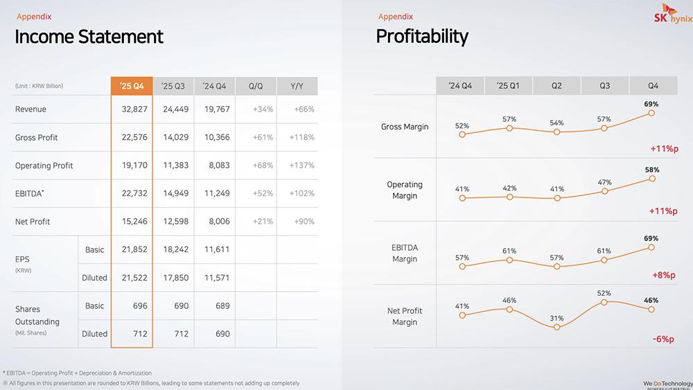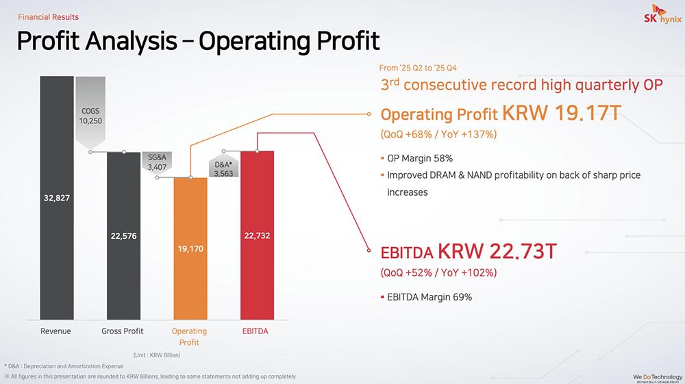 第四季度,SK海力士营收增长66.1%至32.8万亿韩元,营业利润飙升137.2%至19.2万亿韩元,营业利润率高达58%,盈利能力令人瞩目。