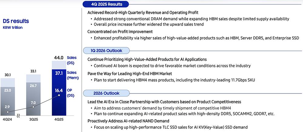 三星DS事业部(包括其存储器、晶圆代工和系统LSI业务)第四季度表现亮眼,营收环比增长33%,达到44万亿韩元;营业利润同比增长超过465%,达到16.4万亿韩元,占集团总营业利润的81%以上。