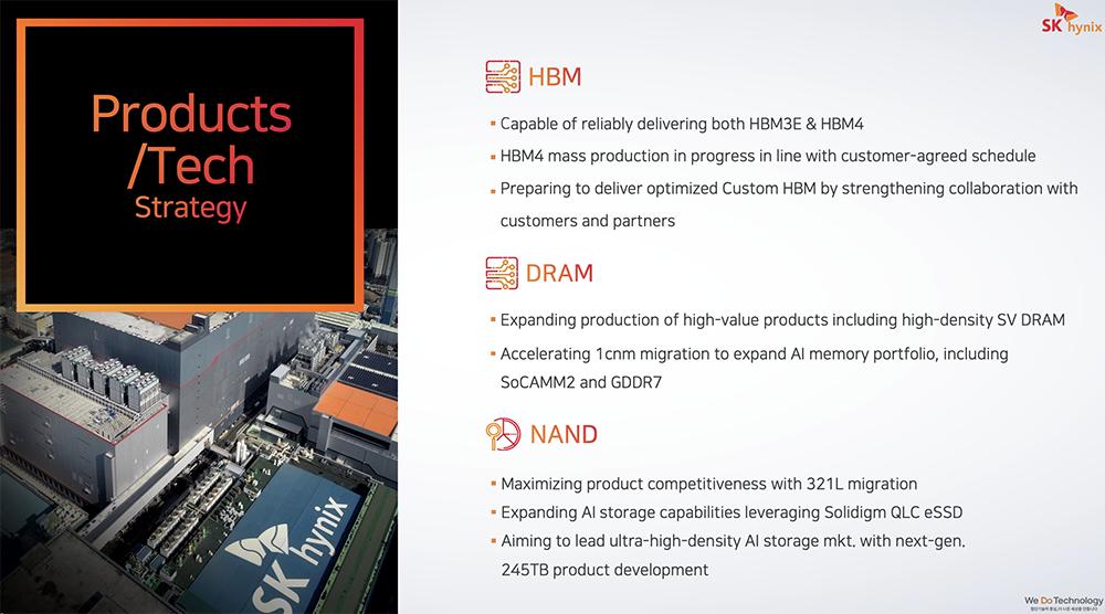 SK海力士称其HBM4量产正按照客户约定的时间表进行,并准备交付优化的定制HBM,扩大高密度SV DRAM等高价值产品的生产,加速1c nm迁移以扩展AI内存产品组合,并在NAND方面通过下一代245TB产品引领超高密度AI存储市场。